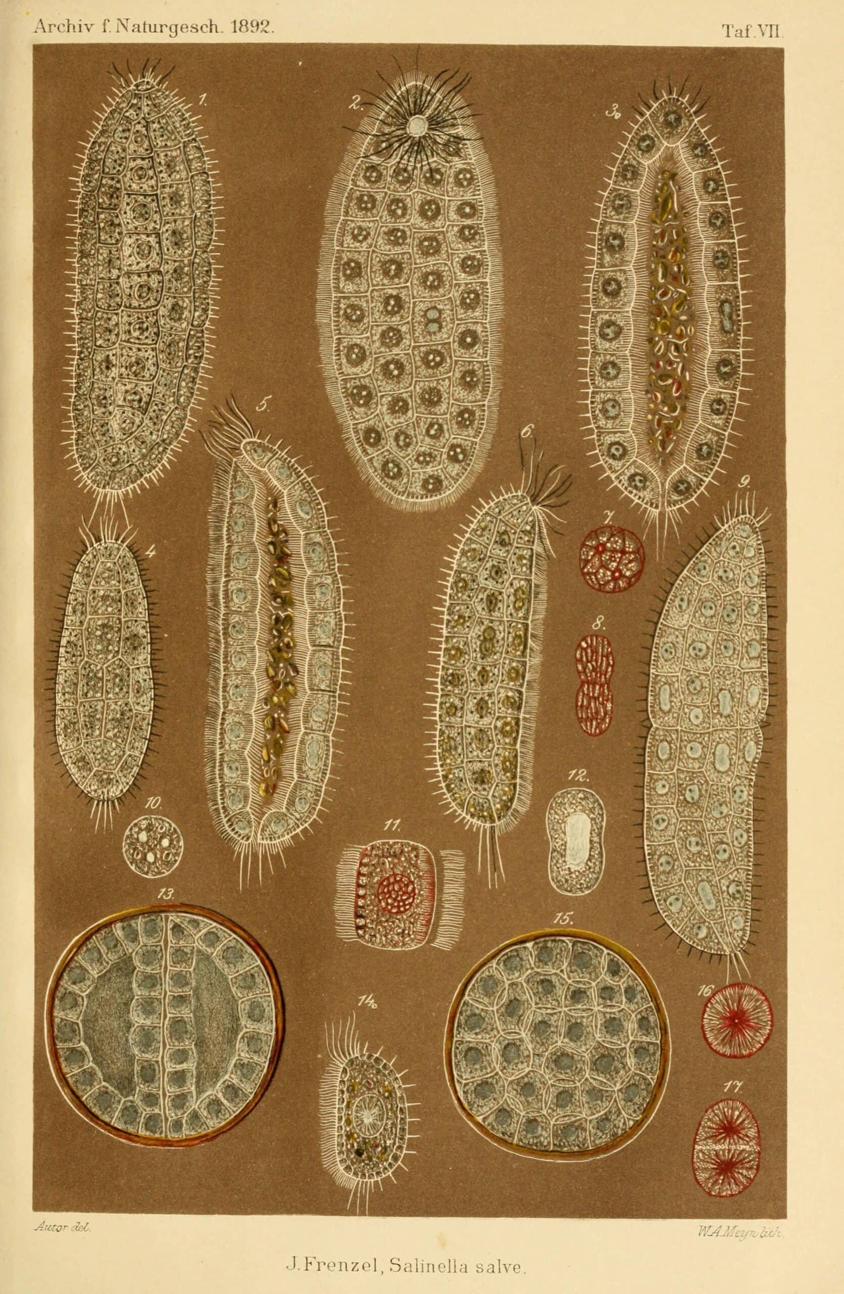 The physical description of Salinella Salve reads like something from a fever dream. Frenzel observed creatures that were sausage-shaped and bilaterally symmetrical. They had what appeared to be a mouth at one end and an anus at the other. Both openings were surrounded by elongated cilia that waved hypnotically in the water.